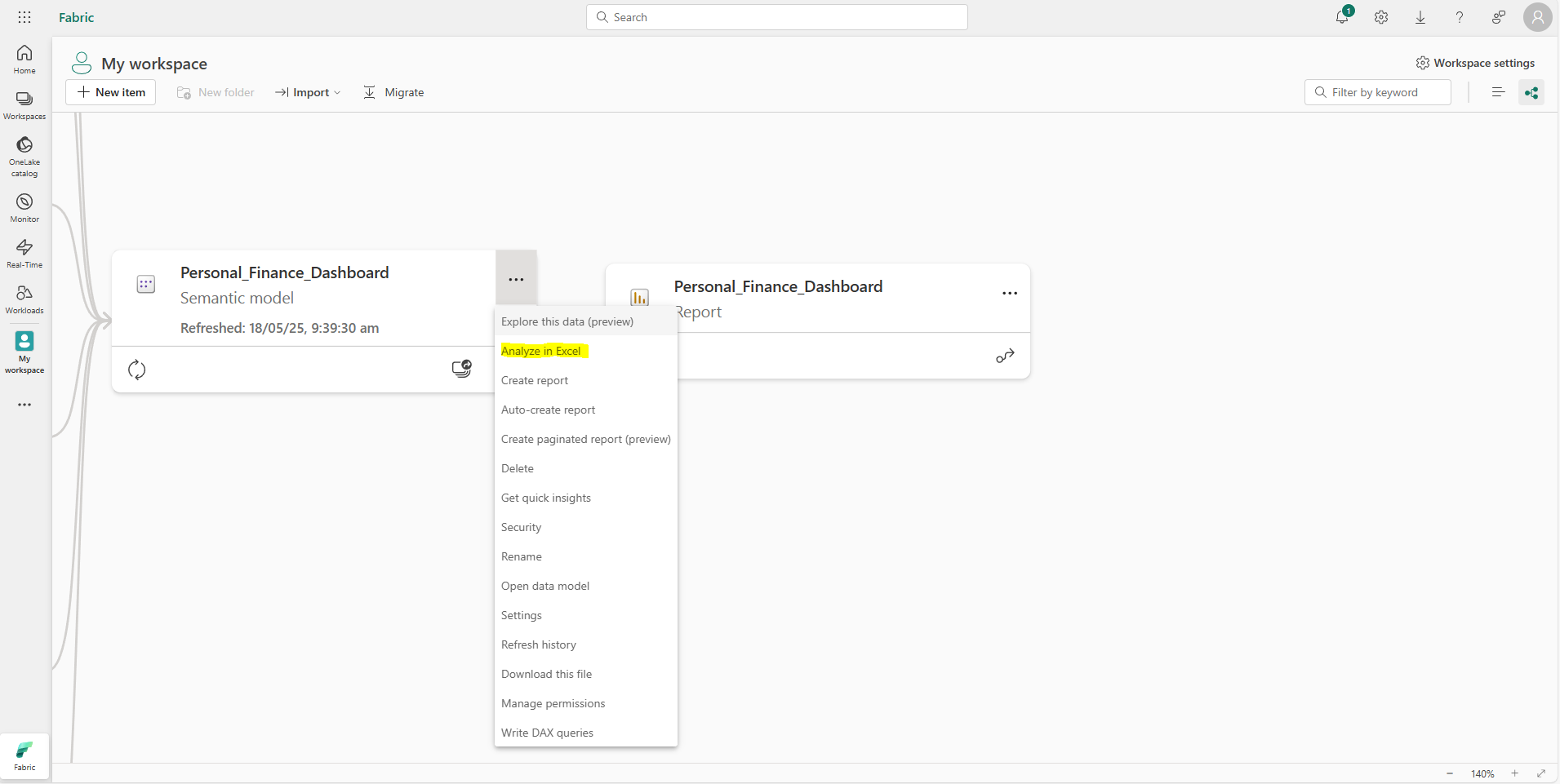 - Select your Semantic Model > ellipses > Analyze in Excel.