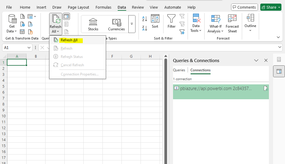 - Data flows directly from the Power BI Service’s semantic model into Excel.